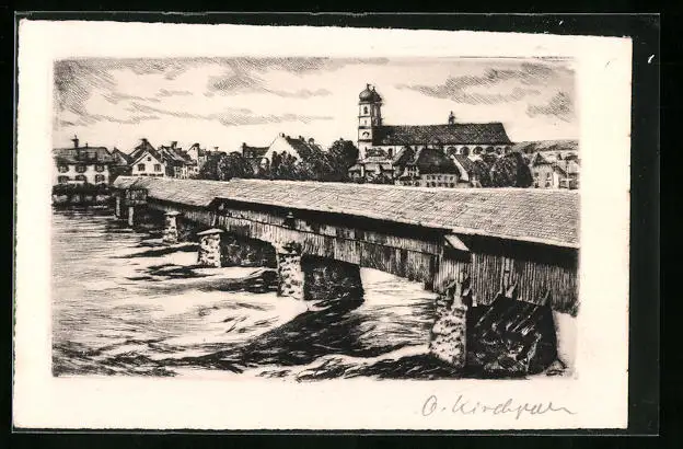 Künstler-AK Säckingen, Partie an der Rheinbrücke