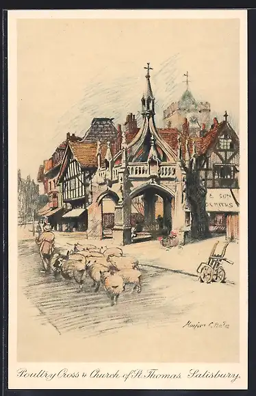 Künstler-AK Salisbury, Poultry Cross & Church of St. Thomas