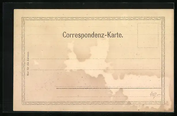 Personenbezogene Daten auf der Rückseite der Karte wurden durch blauen Textmarker unkenntlich gemacht. Die blauen Stellen sind auf die Vorderseite durchgeweicht und wirken sich negativ auf das Postkartenfoto aus