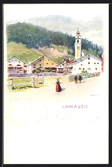 Künstler-AK Samaden, Teilansicht mit Kirche