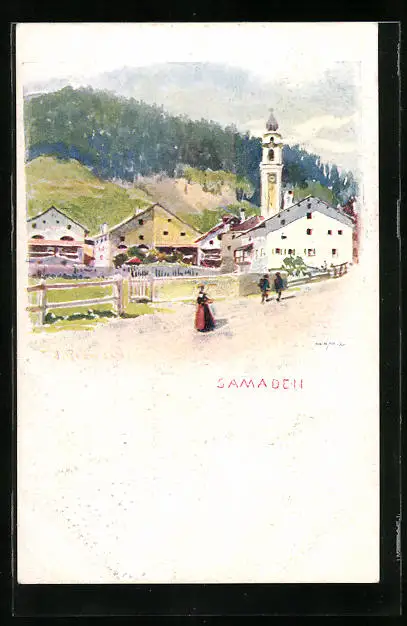 Künstler-AK Samedan, Partie an der Kirche