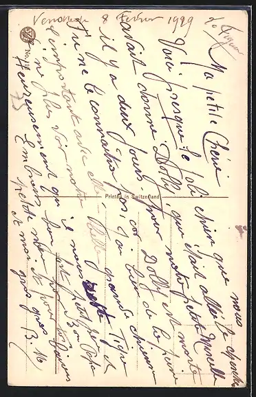 Personenbezogene Daten auf der Rückseite der Karte wurden durch blauen Textmarker unkenntlich gemacht. Die blauen Stellen sind auf die Vorderseite durchgeweicht und wirken sich negativ auf das Postkartenfoto aus