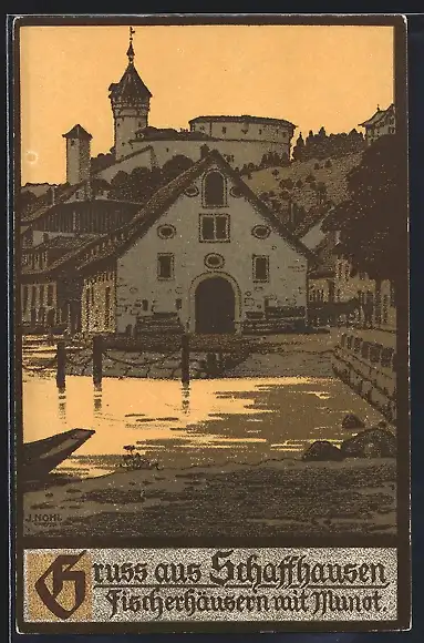 Künstler-AK Schaffhausen, Fischerhäuser mit Munot