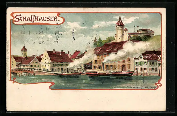 Künstler-AK Schaffhausen, Uferpartie mit Dampfbooten