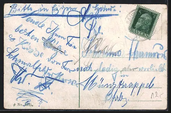Personenbezogene Daten auf der Rückseite der Karte wurden durch blauen Textmarker unkenntlich gemacht. Die blauen Stellen sind auf die Vorderseite durchgeweicht und wirken sich negativ auf das Postkartenfoto aus