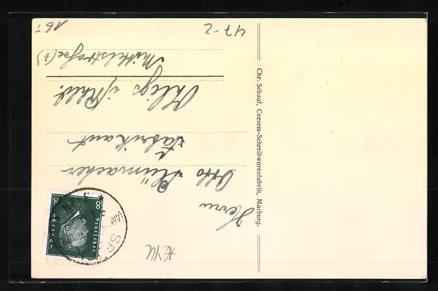 Personenbezogene Daten auf der Rückseite der Karte wurden durch blauen Textmarker unkenntlich gemacht. Die blauen Stellen sind auf die Vorderseite durchgeweicht und wirken sich negativ auf das Postkartenfoto aus