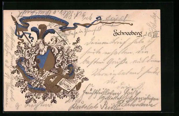 Künstler-AK Schneeberg, Kgl. Gymnasium, Studentenwappen