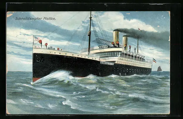 Künstler-AK Schnelldampfer Moltke bei stürmischer See in der Bugansicht