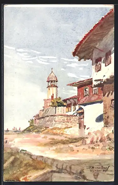 Künstler-AK Schumen, Ortspartie mit Kirchturm