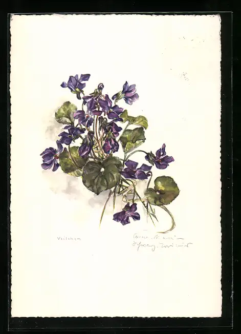 Künstler-AK Schwarz-Torino: Blühende Veilchen mit Blättern
