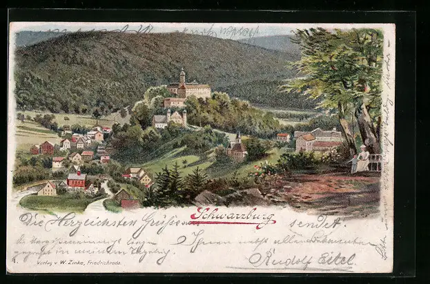 Künstler-AK Schwarzburg, Teilansicht und Baum