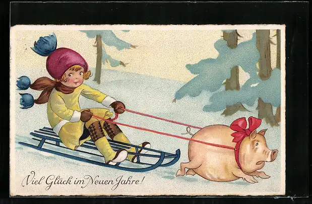 Künstler-AK Schwein zieht Kind auf Schlitten - Neujahrsgruss