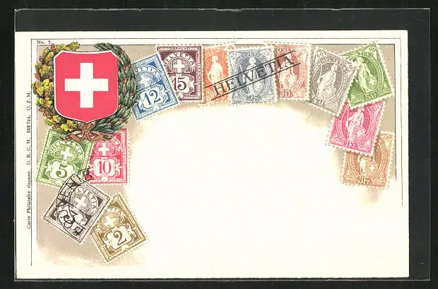 Künstler-AK Schweiz, Briefmarken und Wappen