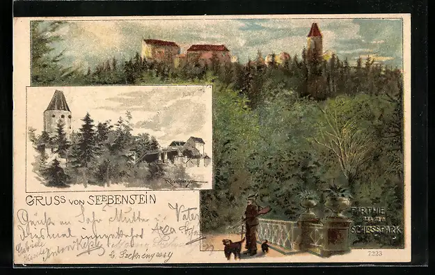 Künstler-AK Seebenstein, Partie aus dem Schlosspark, Jäger mit Hunden