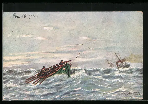 Künstler-AK Seenotrettung eines in Hilfe geratenes Segelschiff bei stürmischer See