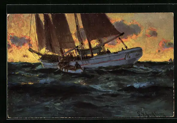 Künstler-AK Segelschiff mit Beiboot in der Dämmerung