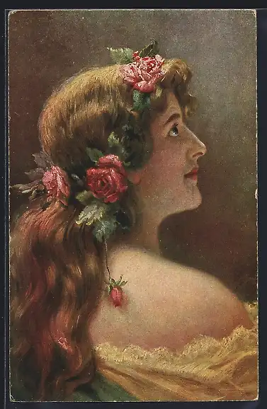 Künstler-AK Seitliches Portrait einer jungen Frau mit Blumen im Haar