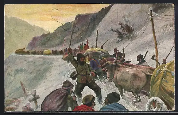 Künstler-AK Serbien, Bulgarische Transportkolonne