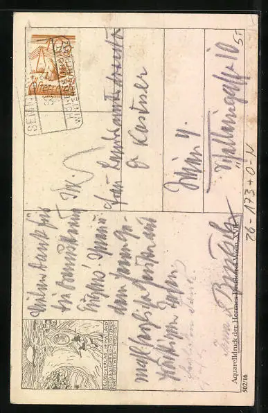 Personenbezogene Daten auf der Rückseite der Karte wurden durch blauen Textmarker unkenntlich gemacht. Die blauen Stellen sind auf die Vorderseite durchgeweicht und wirken sich negativ auf das Postkartenfoto aus