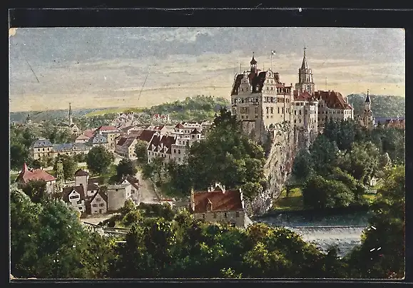 Künstler-AK Sigmaringen, Totalansicht mit Burgberg