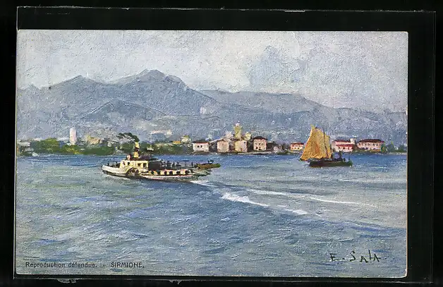 Künstler-AK Sirmione, Dampfer passiert den Ort