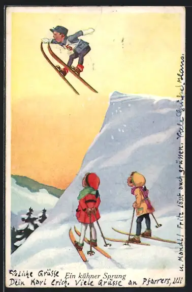 Künstler-AK Skiflieger bei einem kühnen Sprung