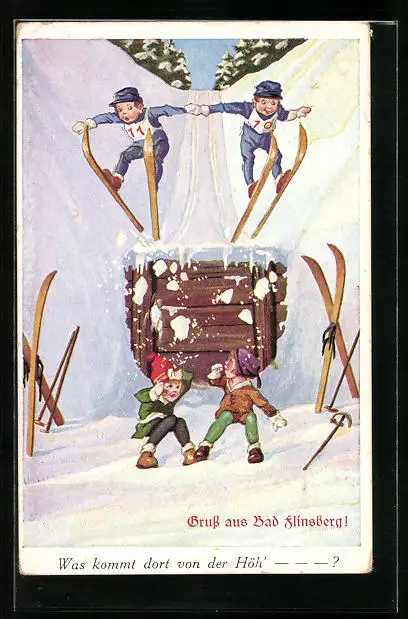 Künstler-AK Skispringerduo beim Absprung