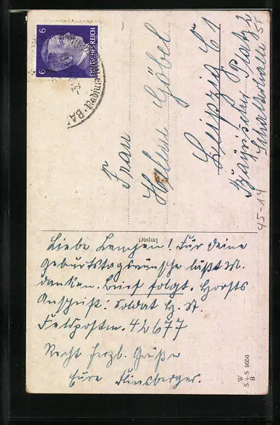Personenbezogene Daten auf der Rückseite der Karte wurden durch blauen Textmarker unkenntlich gemacht. Die blauen Stellen sind auf die Vorderseite durchgeweicht und wirken sich negativ auf das Postkartenfoto aus