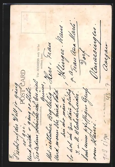 Personenbezogene Daten auf der Rückseite der Karte wurden durch blauen Textmarker unkenntlich gemacht. Die blauen Stellen sind auf die Vorderseite durchgeweicht und wirken sich negativ auf das Postkartenfoto aus