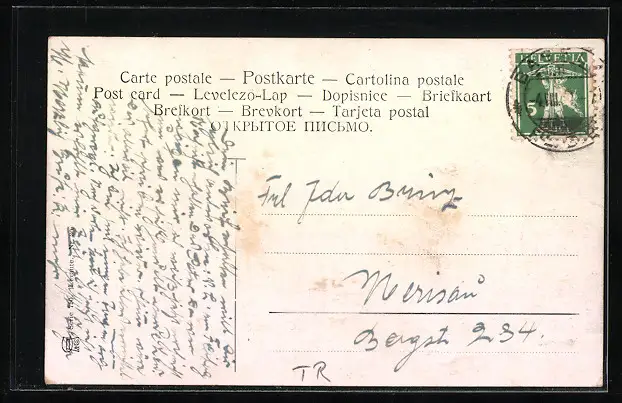 Personenbezogene Daten auf der Rückseite der Karte wurden durch blauen Textmarker unkenntlich gemacht. Die blauen Stellen sind auf die Vorderseite durchgeweicht und wirken sich negativ auf das Postkartenfoto aus