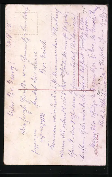 Personenbezogene Daten auf der Rückseite der Karte wurden durch blauen Textmarker unkenntlich gemacht. Die blauen Stellen sind auf die Vorderseite durchgeweicht und wirken sich negativ auf das Postkartenfoto aus