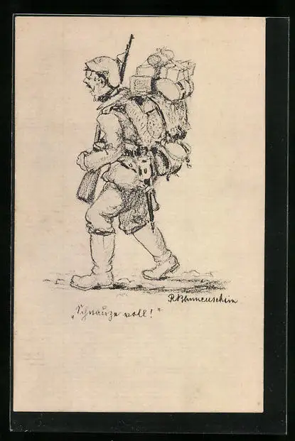 Künstler-AK Soldat der Infanterie mit Ausmarschgepäck beladen