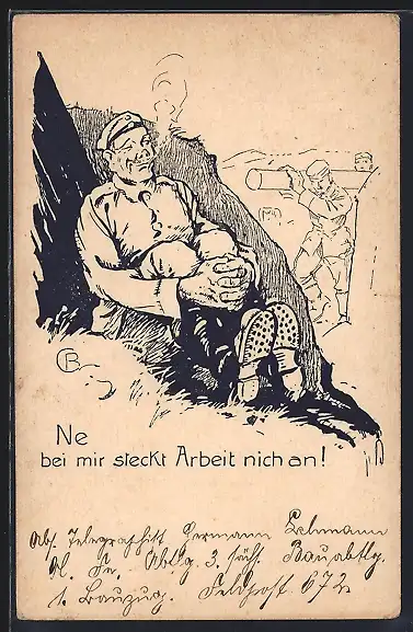 Künstler-AK Soldat drückt sich vor der Arbeit, Soldatenhumor