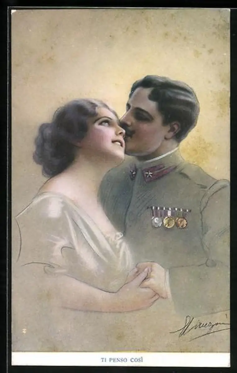 Künstler-AK Soldat in Uniform mit seiner Geliebten, Ortsansicht