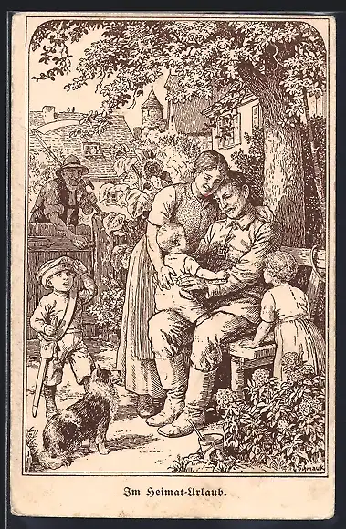 Künstler-AK Soldat zu Hause bei seiner Familie, umgeben von seinen Kindern