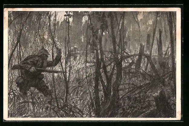 Künstler-AK Soldaten der Infanterie in den Wäldern Frankreichs