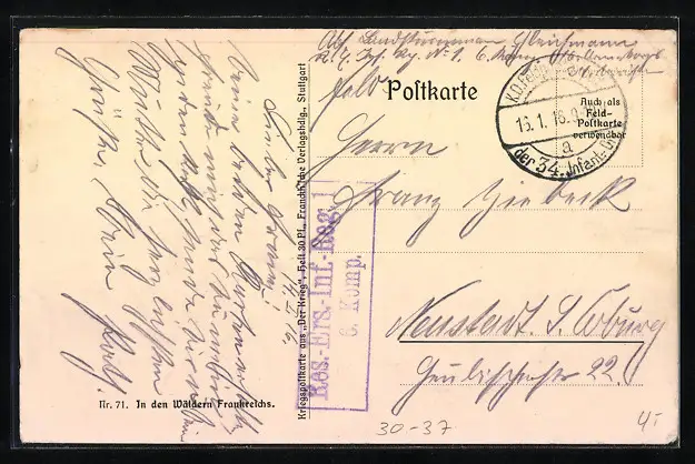 gelaufen 1915, Eckknicke links u. rechts, guter Zustand