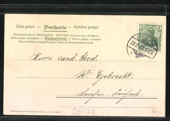 alte Ansichtskarte, gelaufen 1903, leichter Eckknick unten rechts, sonst guter Zustand