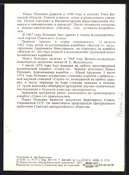 Künstler-AK Sowjetischer Kosmonaut Popowitsch