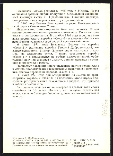 Künstler-AK Sowjetischer Kosmonaut Wolkow