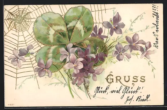 Künstler-AK Spinne im Netz hinter einem vierblättrigem Kleeblatt