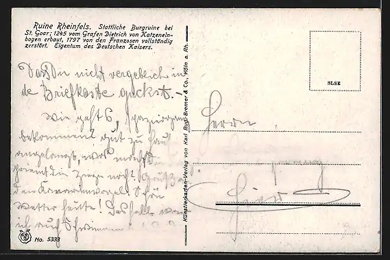 Künstler-AK St. Goar, Blick zur Ruine Rheinfels