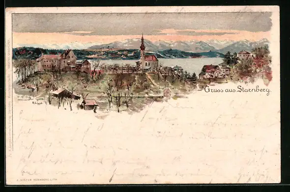 Künstler-AK Starnberg, Generalansicht mit Gebirgspanorama