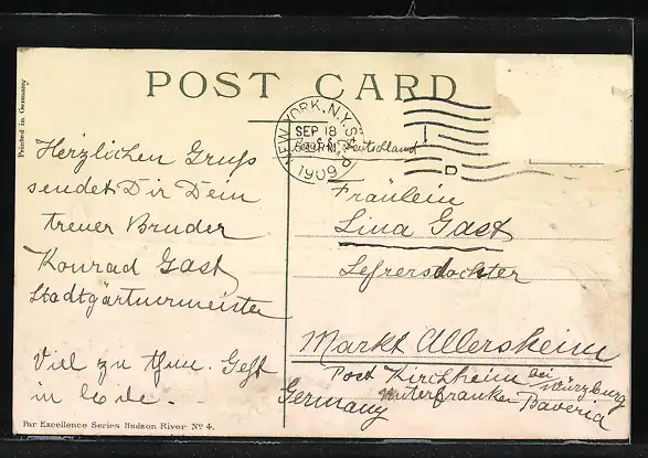 alte Ansichtskarte, gelaufen 1909, Briefmarke entfernt, rückseitig Oberflächenschaden, guter Zustand