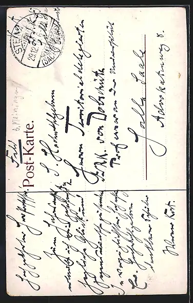 Personenbezogene Daten auf der Rückseite der Karte wurden durch blauen Textmarker unkenntlich gemacht. Die blauen Stellen sind auf die Vorderseite durchgeweicht und wirken sich negativ auf das Postkartenfoto aus