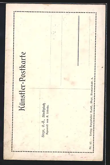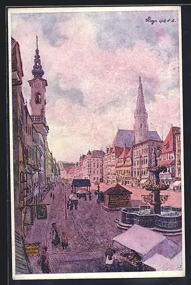 Künstler-AK Steyr /O.-Ö., Stadtplatz mit Kirche und Brunnen