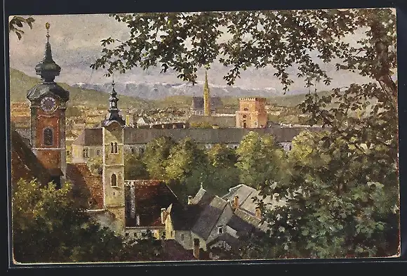 Künstler-AK Steyr, Ortsansicht mit Kirche