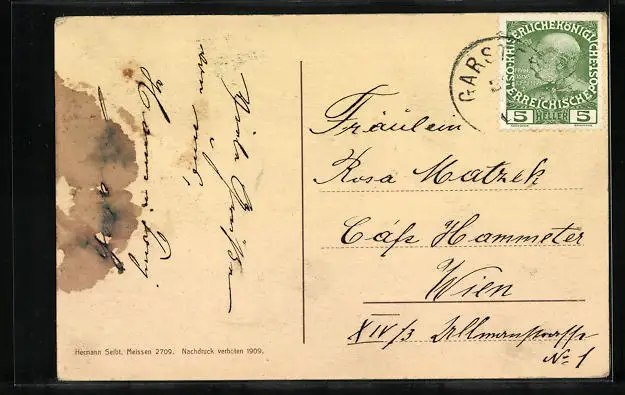 Personenbezogene Daten auf der Rückseite der Karte wurden durch blauen Textmarker unkenntlich gemacht. Die blauen Stellen sind auf die Vorderseite durchgeweicht und wirken sich negativ auf das Postkartenfoto aus
