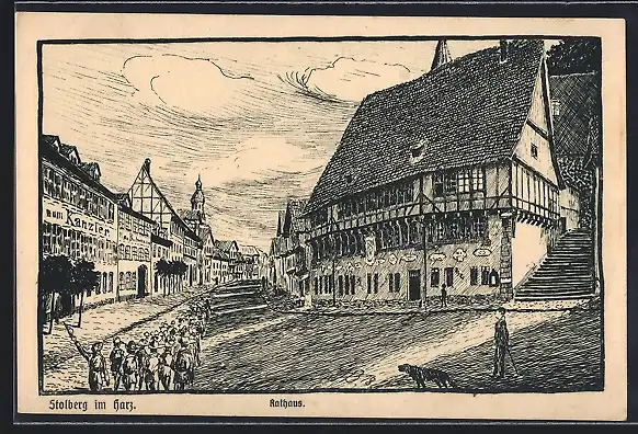 Künstler-AK Stolberg / Harz, Partie am Rathaus