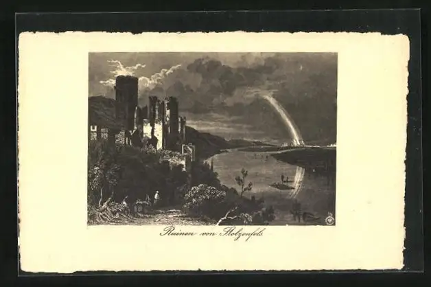 Künstler-AK Stolzenfels, Uferpartie mit Ruinen